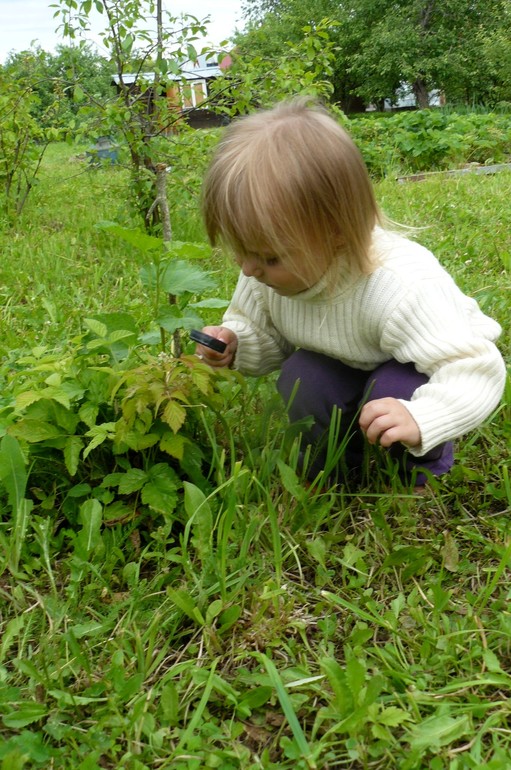 С нашей маленькой лупой Света обошла всю дачу, рассмотрела все листочки, букашек, цветы, крыльцо и кирпичи, а потом разглядывала мои и Танюшкины брови и ресницы, поры и волоски на руках, и даже язык крохи.