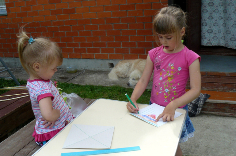 Затем девчонки сами раскрасили заготовки для своих вертушек. На даче принтера нет, поэтом мы сделали простой вариант с загнутыми углами.