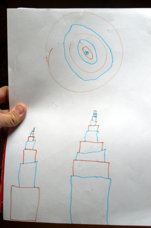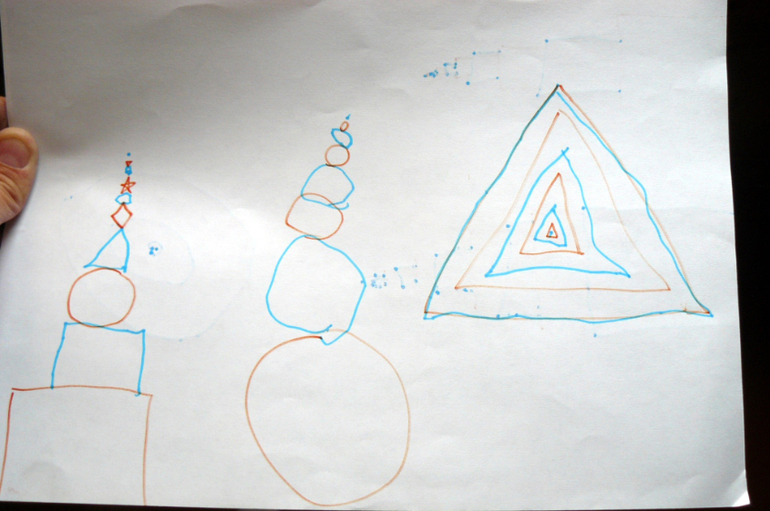 Игра очень понравилась Светику! Мы и одинаковые фигуры рисовали, строя башню (постепенно уменьшая размер), и с условием, чтоб рядом одинаковые не стояли, и круги друг в друге от большего к меньшему. Прекрасное развлечение "на коленке" для случаев, когда долго едешь или в очереди.