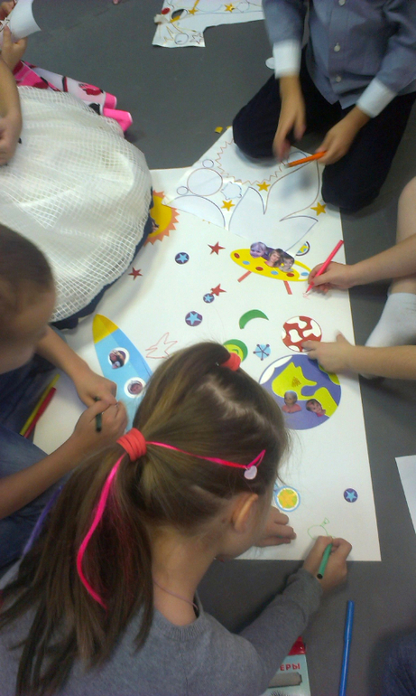 Потом юные путешественники сделали гигантскую аппликацию о космосе с помощью наклеек. Каждый гость приклеил свою фотографию на плакат. Кто-то летел на ракете, кто-то перемещался на летающей тарелке, а кто-то гулял по Солнцу :) Дети еще и рисунками дополнили картину. Процесс увлек не на шутку ))