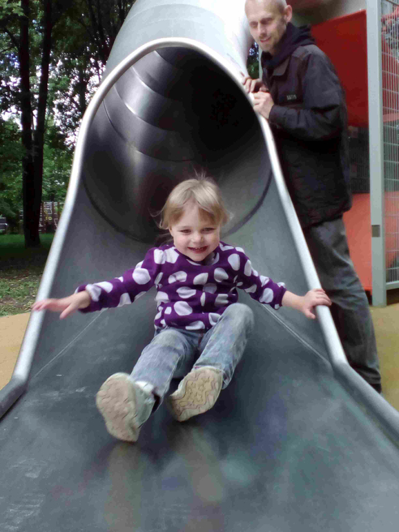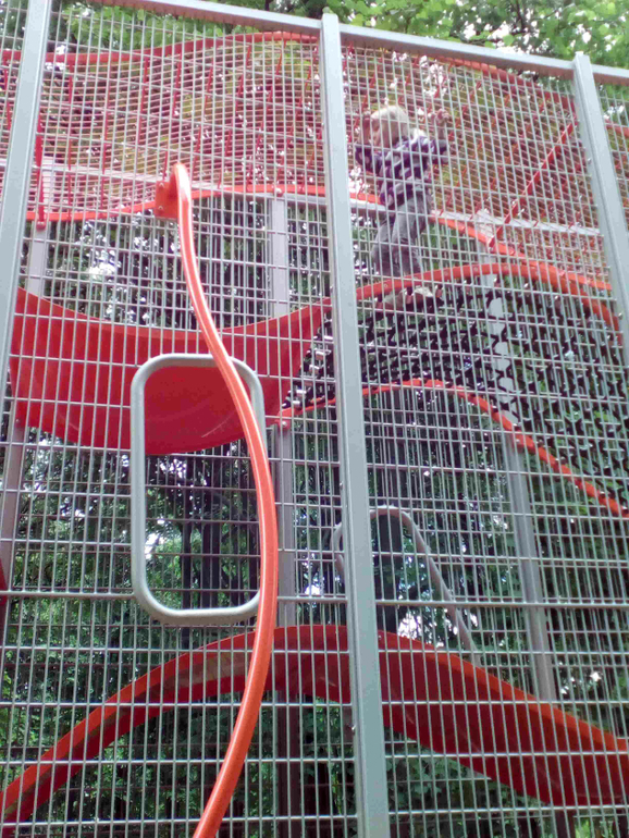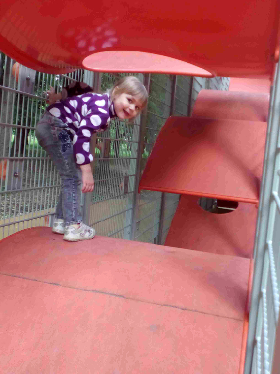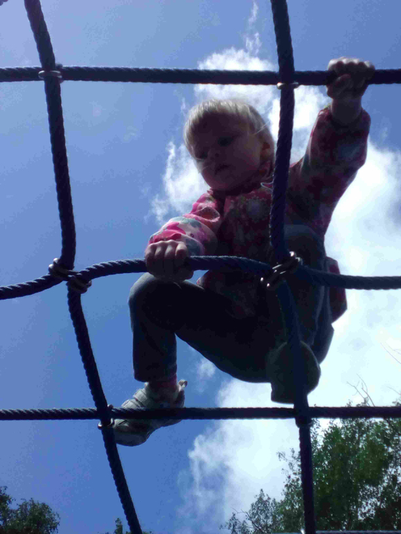 Нашли удивительную горку, на которую надо забираться по веревкам. Таня бесстрашно лезет! Фотографировала я ее снизу.