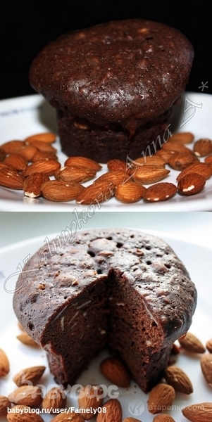 100Гр масла,3-4 ложки муки,орехи,100гр.шоколада,3 яйца,1 ч л разрыхлителя,выливать почти полную форму.и сахара ст ложку..