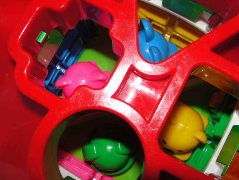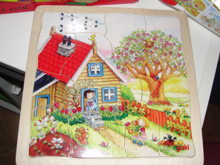 4) Домик сортер...через крышу нужно воткнуть фигурки фивотных основанием которых служат геометрические фигурки...Дверцы замыкаются ключиком по цвету...Еще под крышей есть секретики, которые нужно разгадать, что бы фигурка провалилась внутрь...