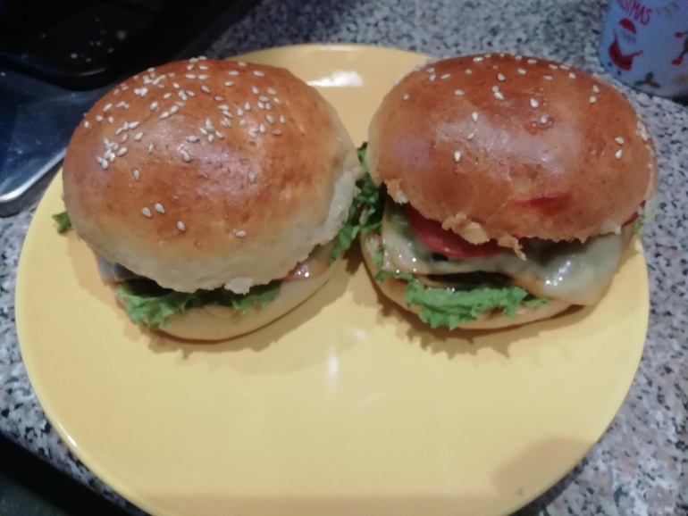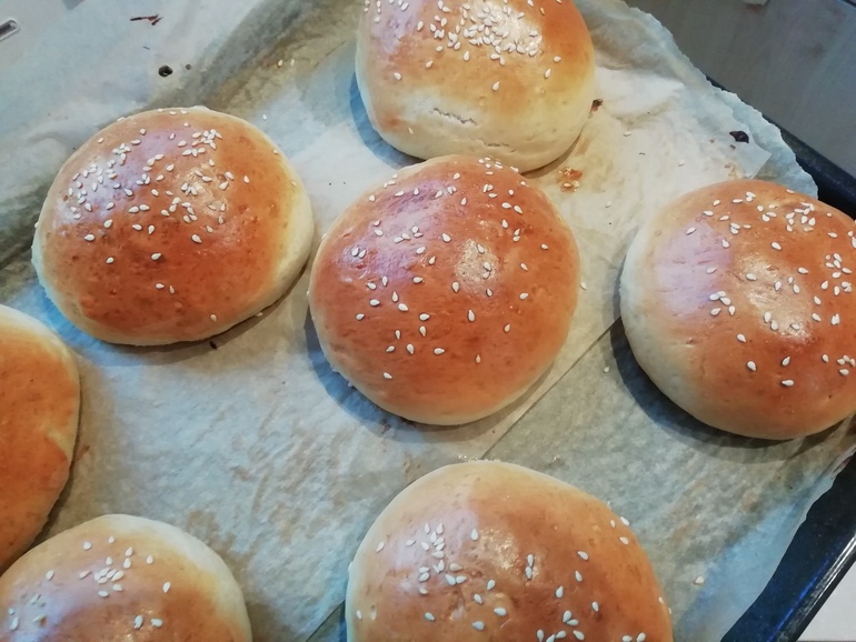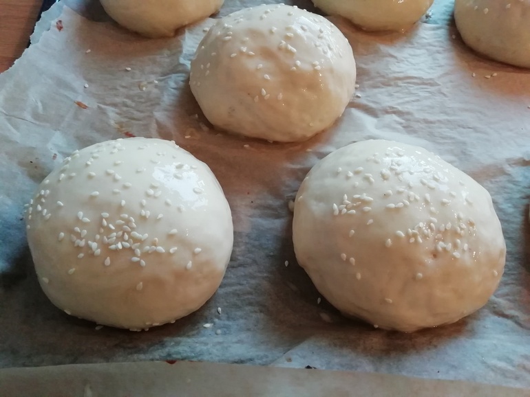 7 грам дрожжей сухих + 2 ст.ложки теплой воды, пускай постоит 5 мин. Растопить сливочное масло (80 гр) и добавить меда 1 ст.л. и все это надо добавить к дрожам, все вместе перешешиваем, потом молоко добавить теплое 350-400 мл, добавляем одно яйцо и потом муку примерно 500-600 гр и 1/2 ч.с. соли, я все мещала комбайном. И потом оставить на два часа, потом формировать круглые булочки и на протвине еще оставить на час. Потом обмазать булку(яйцо+ 2 ст.л воды), выпикать при 200 градусов 15-20 мин.