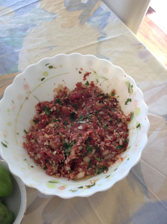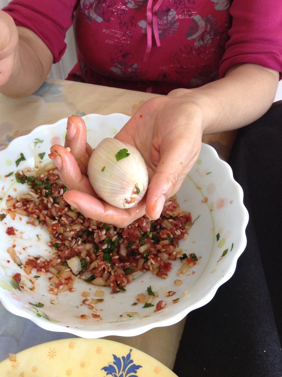 затем начиняем фаршем. Маленький шарик складываем внутрь и заворачиваем