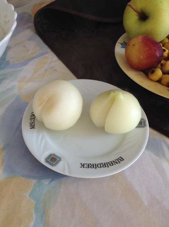 Две большие луковицы чистим и разрезаем до половины, ставим вариться немного. Минут 10 пусть покипят. Через минуты 3 можно снять верхние слои, чтобы не сварились