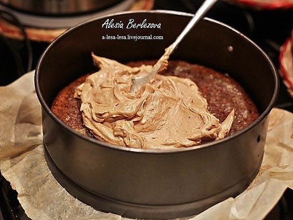 5. Бисквит прослоить кремом, я это делала прямо в форме и дала ему немного постоять в холодильнике.