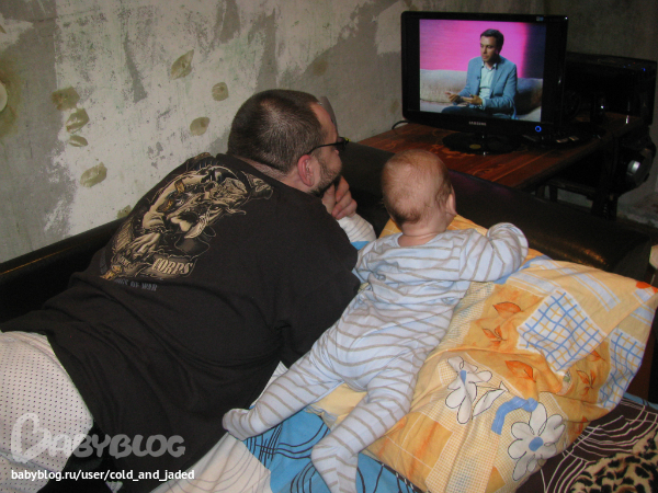 Смотрят Битву экстрасенсов(на стены внимания не обращаем, у нас тут ремонт все никак не доделаем) Что-то он у меня везде все время что-то смотрит, прям дитя прогресса)))