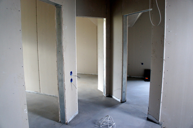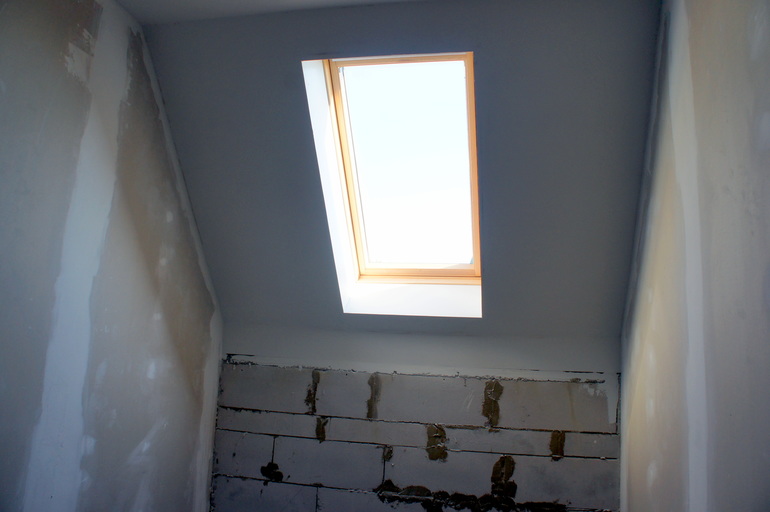 Это 3 спальни. Левее стоят кладовка и санузел, не стала фоткать. Сейчас пошла штукатурка второго и первого этажа. Вот фотка окошка над лестницей - уже сделаны откосы.