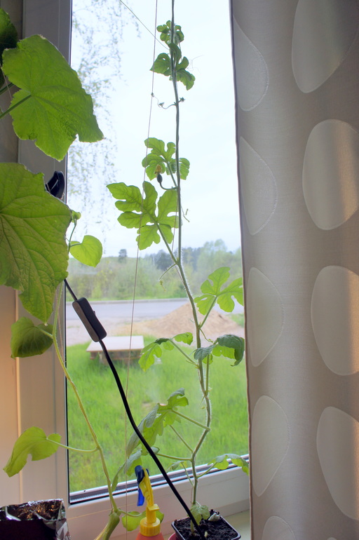 Арбузик мой растет просто на рекорд по-моему. Завязал плод, я его опылила вручную =) Он сейчас завязывает второй! Вот завтра наверно буду опылять. Он уже около метра, если не больше. Задаю себе вопрос - как я его повезу в деревню...Как он перенесет пересадку... Хотя вот на днях я его пересадила из мелкой тары в пакет, чтобы удобно было везти...и ничего, все отлично. Посмотрим, как он поведет себя после пересадки в грунт.