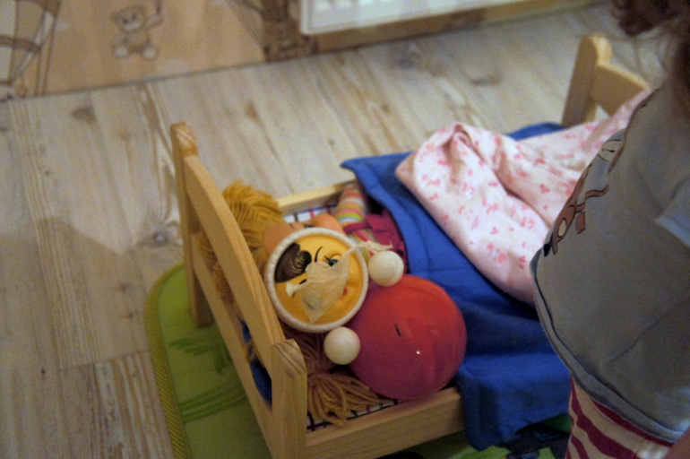 С этим видом деятельности у моей дочери явные проблемы. Ни градусник поставить кукле или мишке, ни пластырь наклеить...все с явной истерией снимается...Зато на следующий день говорила - ляля бобо и даже уложила в постель и налепила пластырь =) на глаз, ну и ладно =))