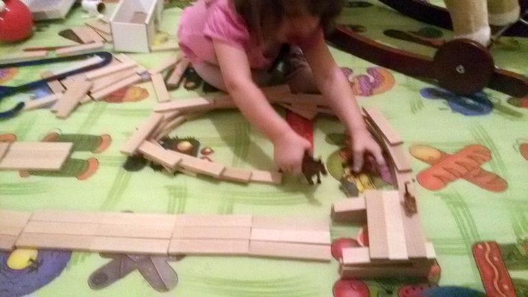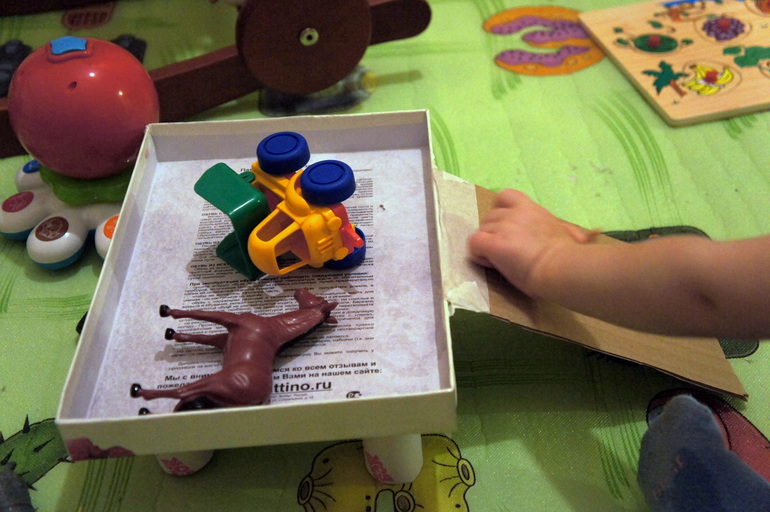 Намыли, пошла я делать гараж =) Сварганила из подручных средств. Сначала это была горка =) с нее скатывалась лошадка и машинка. Потом Аня не выдержала видимо маминого творчества и начала мое исскуство ломать...