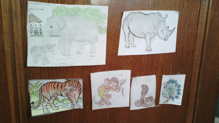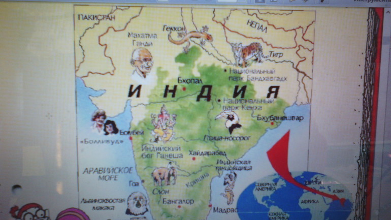 Не задумывалась раньше, где происходит действие этой песни))) А ведь и правда, тигры не водятся в Южной Америке, но ведь и туканы не водятся в Индии? Песня-загадка) Внимание на это обратили,но повеселиться с чудесной песней нам это не помешало,она классная! А потом пели эту же песню, но подставляли животных, которые есть в Индии и выкладывали их на карту. Правда, сразу я не сфотографировала, сделала фото уже когда на стенд,посвященный Индии вывесила) Вот они