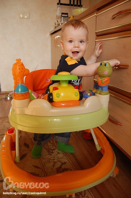 Открывает ящики и дверцы, жмет на кнопки на все, какие под руку попадутся (на игрушках, на пульте, на телике, везде).Стал бубнить бу-бу-бу и ня-ня-ня. Ма--ма-ма выдает только когда я его очень достану (например с аспиратором).