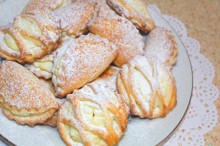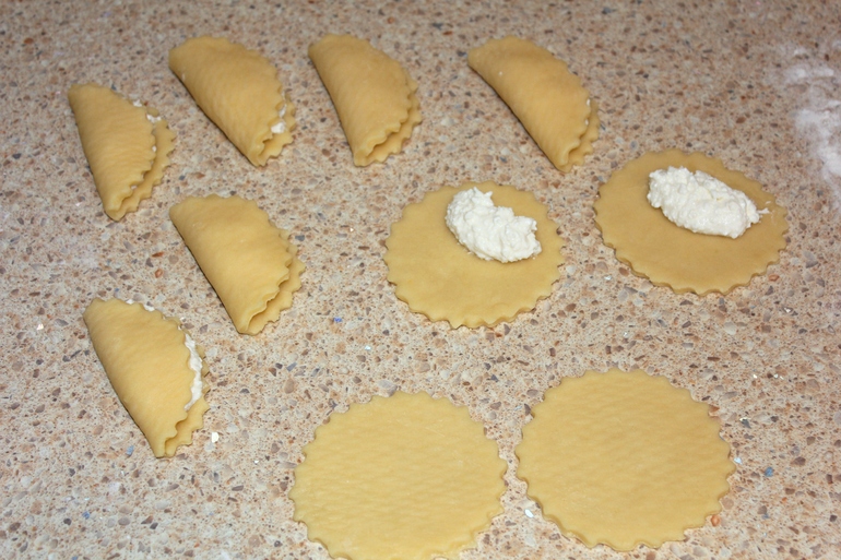 На середину каждого круга выложить творожный фарш (1 чайная ложка)