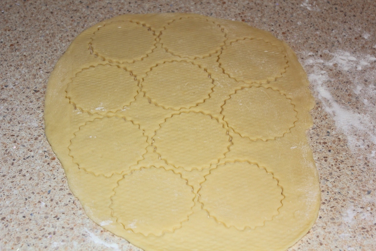 Тесто раскатать в пласт толщиной примерно 5 мм. Выемкой вырезать кружочки