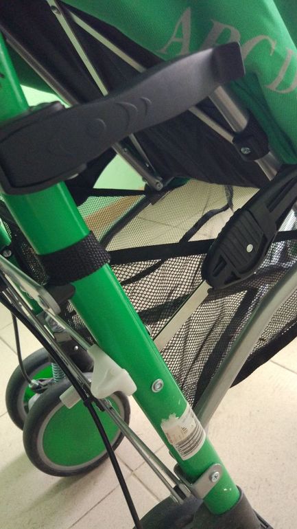 Удобные ручки. Передние колеса крутятся. Фиксатор втулки отсутствует. Тормоз на заднем правом колесе. Амортизаторы.