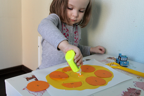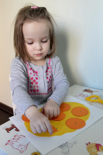 К сожалению,не все успеваю фоткать,выкладывать,не обо всем рассказывать.Сейчас мы безумно много беседуем(развиваем речь,кругозор и общаемся).Прохожие думают,что я сумашедшая,наверное,рот у меня не закрывается на улице вообще) И дома беседуем.Все материалы возникли не из воздуха,а являются продолжением каких-то разговоров,ситуаций.Например,варили мы картошку,мыли ее и чистили.Потом Ханюська занималась аппликацией.Сосредоточенно,не спеша,рассказывала и показывала своей плюшевой подружке обо всем: