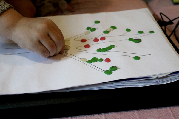 Гуляли,разговаривали о вишне,пришли и слепили ее.Здесь все:листики,потом цветочки,потом ягодки: