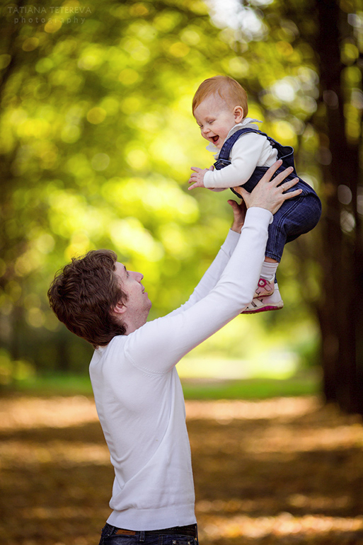 Когда-то давно я устанавливала для таких кадров серийную съемку, чтобы впоследствии выбрать лучший. Потом до меня, наконец, дошло, что эффективнее делать по-другому: фотографировать в тот момент, когда ребенок находится в максимально высокой точке полета. Это упрощает задачу "заморозки" движения, ведь на доли секунды малыш зависает в воздухе, и шансы получить смазанный кадр меньше. Как раз в эти доли секунды и нужно успеть сфокусироваться и сделать кадр. А чтобы это успеть, есть маленькая хитрость: заранее наведите фотоаппарат на то место, в которое должен прилететь ребенок, и как только увидите его в видоискателе, нажимайте кнопку спуска затвора. Естественно, ребеночка папе придется подбросить вверх не один и не два раза.))) Если модели стоят к вам боком, можно сфокусироваться на папе.