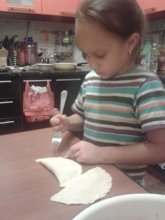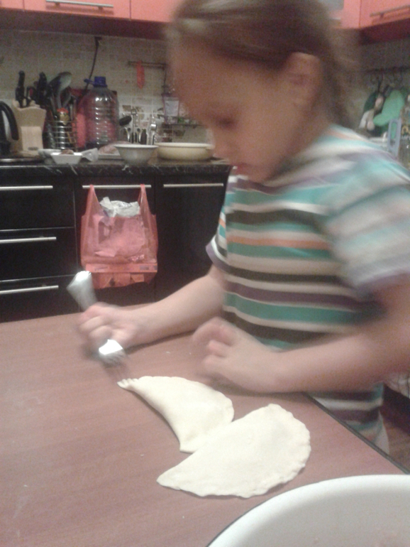 Вот Викуля помогает дедушке лепить чебуреки. У нее это хорошо и отлично получается.