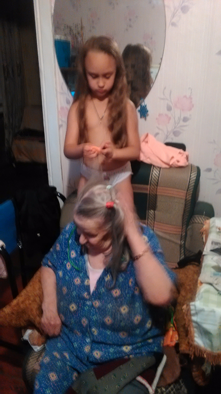 Вика делает бабушке прически-этим летом.говорит-бабуля,ты у меня красивая