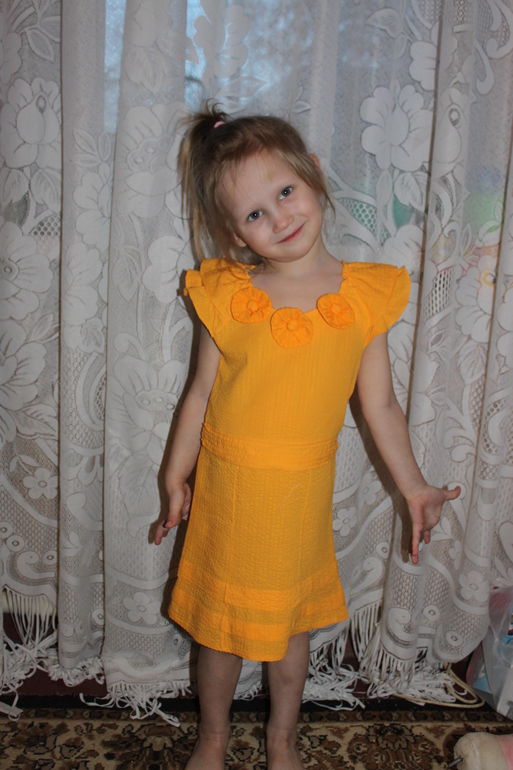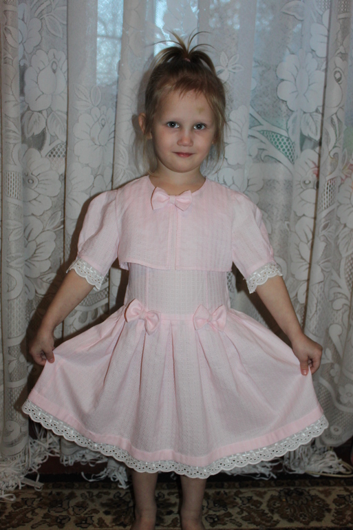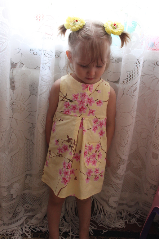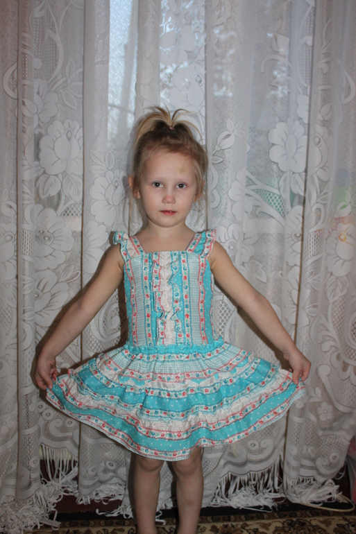 эту ткань я покупала 1 м, а с оставшихся кусков получилось вот такое платье для маленькой