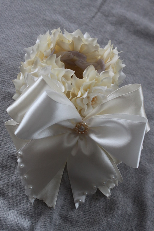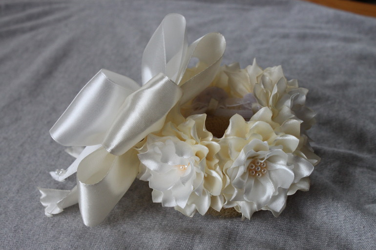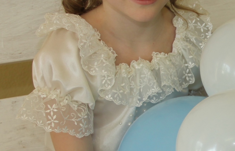 Платье не чисто белое, чуть-чуть сливочное. Когда покупала ленту, мне сказали, что это следующий после белого тон. У меня осталось много полубусин и кружево есть, как на отделке рукавчиков (если вдруг пригодится)