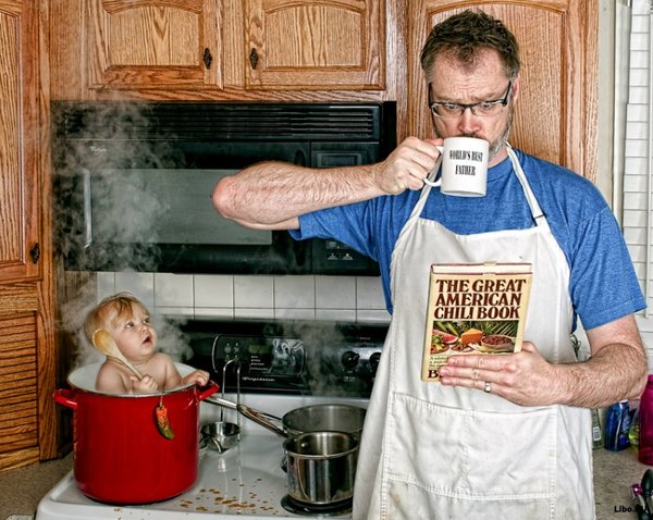 Пока папа на работе, а мама в декретном отпуске, за ребенком обычно присматривает она. Следит мама, чтобы дитя было накормлено, вымыто, переодето, вовремя уложено спать, ходит с малышом на прогулки, играет в игры, читает сказки и напевает песенки. Но иногда случается так, что наедине с ребенком должен остаться отец... На этих фотоснимках папа отчаянно старается справиться с ролью няньки для маленькой непоседы, но постоянно путает рекомендации, оставленные супругой. Так, маленькая Элис оказывается то в кастрюле с супом, то в стиральной машинке, окутанная пеной.В результате получается как в анекдоте: "Дорогая, я сделал все, как ты просила. Детей сварил, борщ постирал, белье накормил".