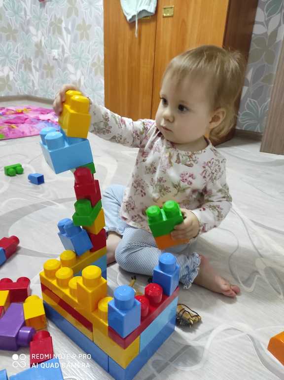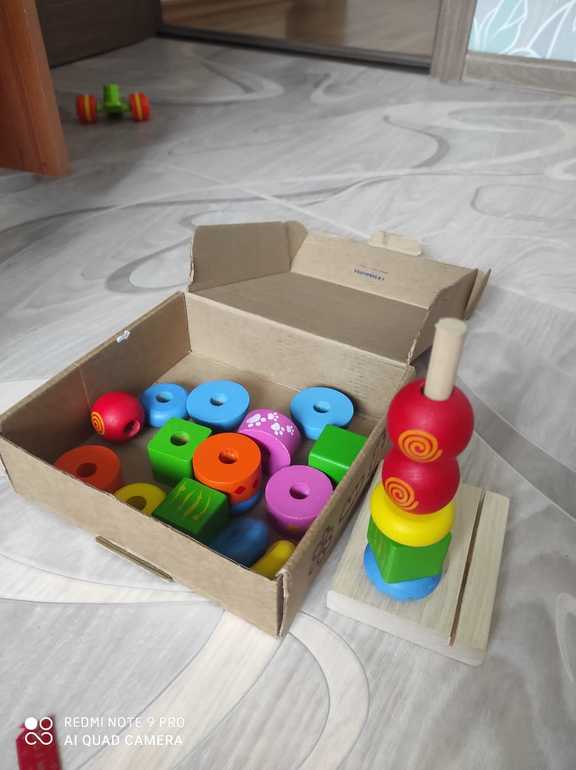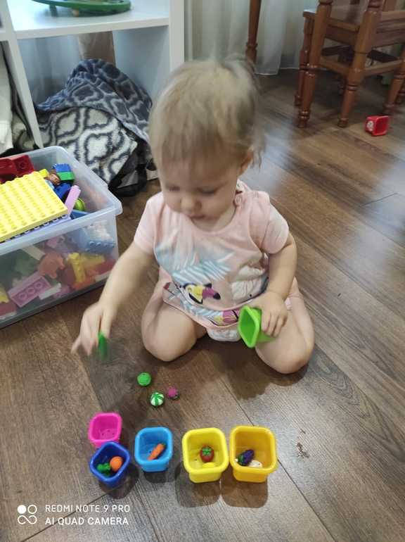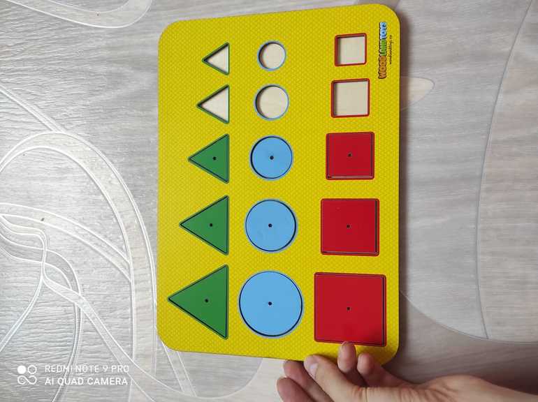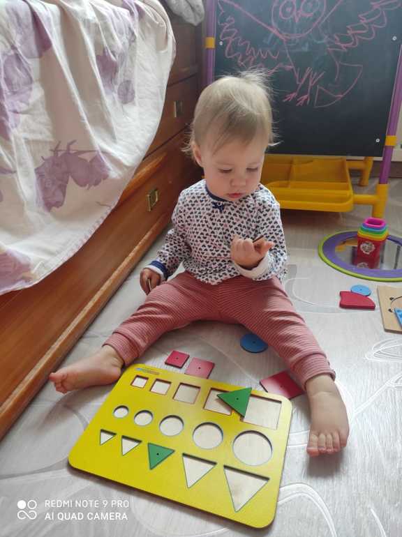 Лежала давно такая штука, боялась опять давать изза мелких деталей. да и написано что от 3+ но под присмотром начала давать, кружочки собирает пальчиками, я конечно показываю куда какой. иногда и сама вставляет куда надо. Треугольники на втором месте по популярности. квадратики не любит, видимо сложнее вставлять