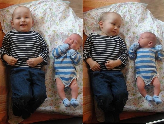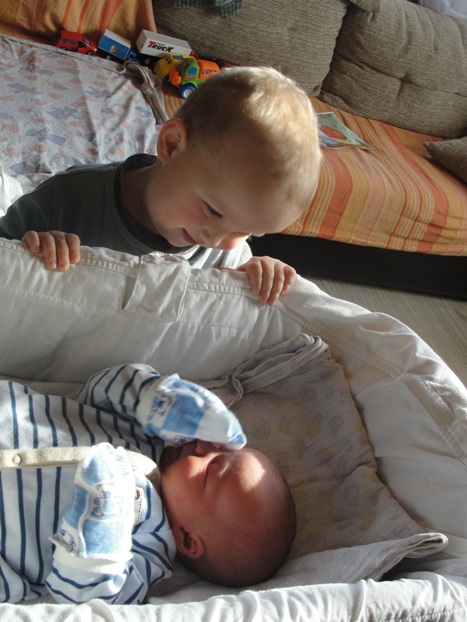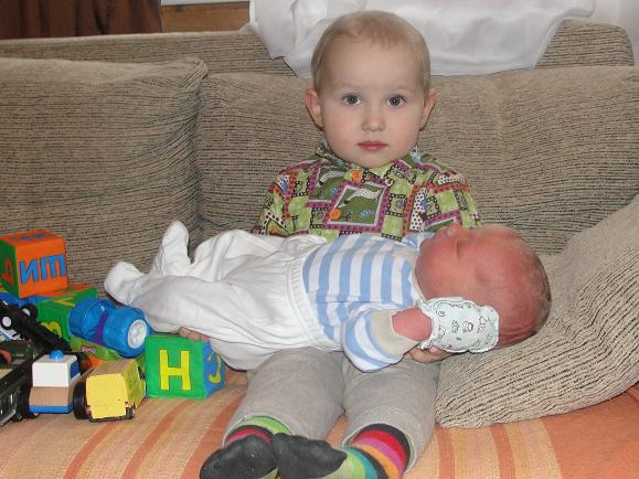 Малыш у нас хороший, люблю его держать на руках, все время прошу маму, чтобы дала подержать :)) Показываю машинки и поезда. А кушать он только может молочко из маминой сиси, а я пью из стакана. Спим сначала по правилам - я в своей комнате и в своей кровати, малыш в люльке рядом с мамой, но под утро оказываемся все вчетвером - мама с двух сторон с малышами и папа рядышком.