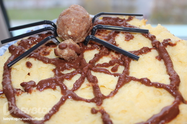 Еще сделали запеканку, она подгорела и поэтому пришлось снять верхний слой. Украсили паутинкой и паучком.