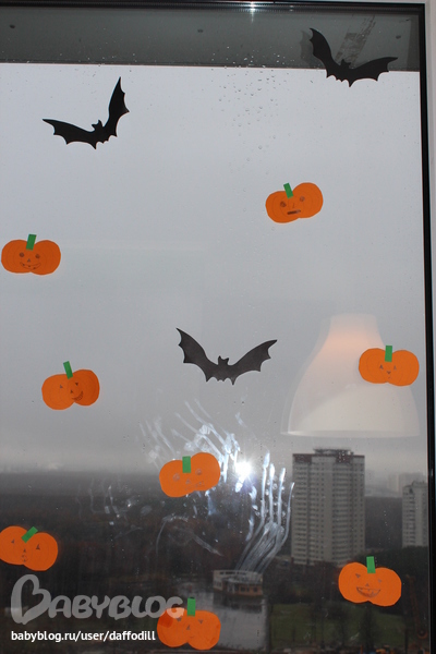Начали с декора, вырезали летучих мышей и тыковки (Серега сам приклеивал хвостики) и приклеили на окно. Сразу видно кто приклеивал (все окно заляпано :)).