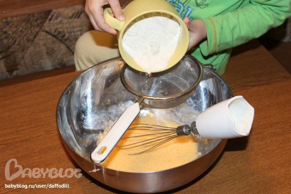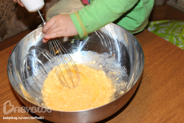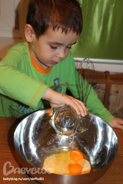Я обычно насыпаю (наливаю) все ингридиенты в различные емкости и тогда ребенку очень легко "приготовить" все самому. Насыпал (налил), перемешал и готово :).
