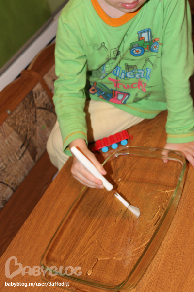 Серега хотел проехать паровозиком, чтобы остались отпечатки, но я предложила лучше нарисовать машинку, не удержался обводит сам, чтобы "лучше видно было" :)