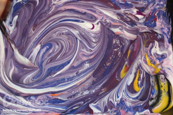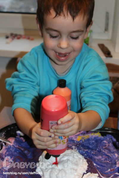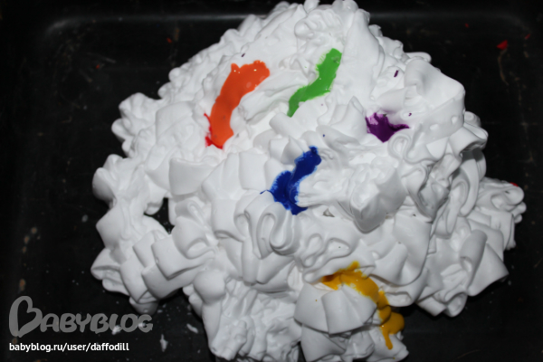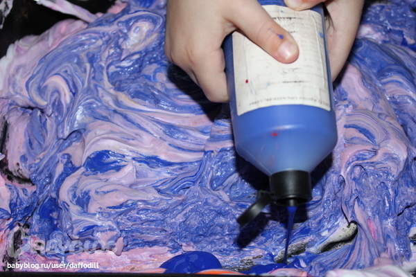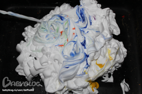 В итоге получилось вот ЭТО :). От процесса получили истинное удовольствие (если не считать запах пены), а результат не так уж и важен :). Пытались еще в процессе сделать отпечаток на бумаге, но как-то не очень получился.
