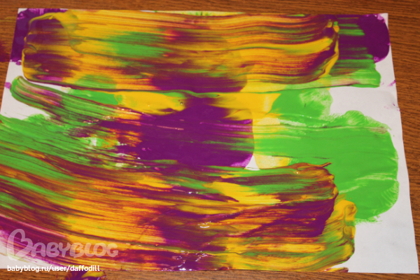 Потом налили красок на бумагу и сложили пополам, решили немного растереть губкой, чтобы краска лучше разошлась, пока отвернулась, Серега уже раскрыл бумажку и провел по ней губкой. Тоже неплохо получилось. Отобрала рисунок, пока не превратил его в огрязное месево (как обычно). Но губкой рисовать понравилось. Пришлось продолжить.