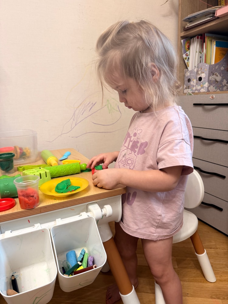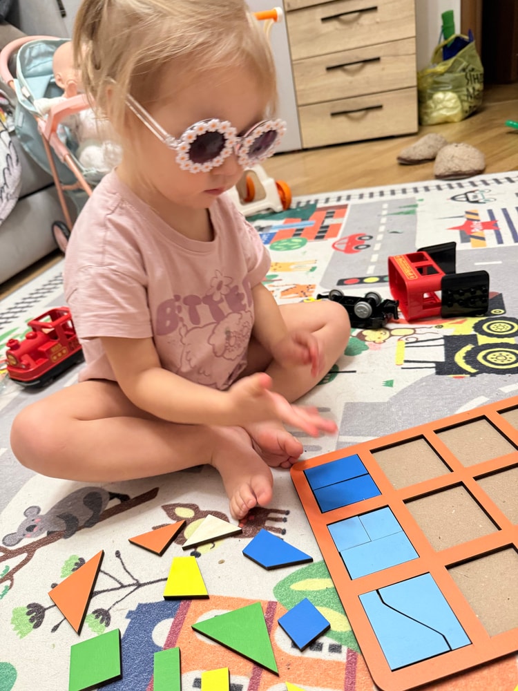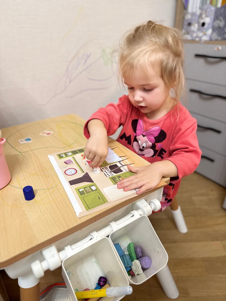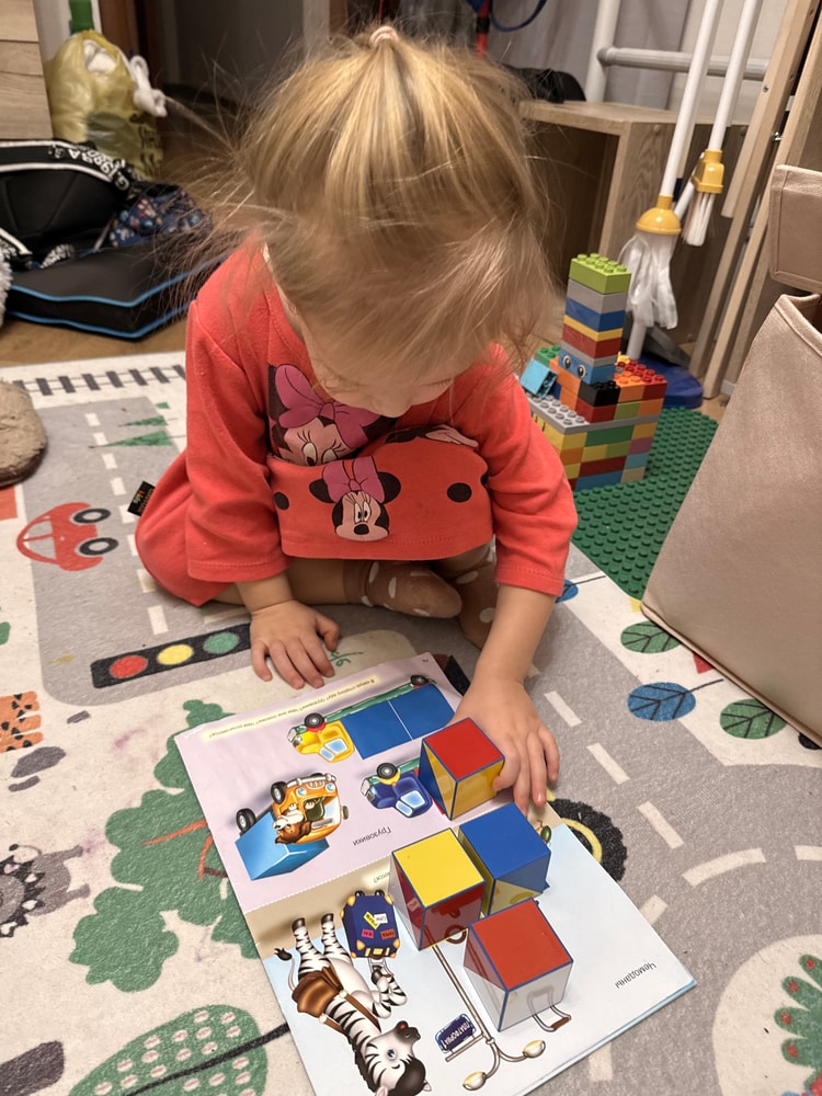 Очень любит рисовать, клеить аппликации, наклейки, делаем тетради Я могу, тесты Земцовой на 2-3 года. Читаем очень много, больше всего любит стихи. Конструктор Лего дупло на ура, пазлы полюбила. Живые картинки попробовали, поняла как играть.