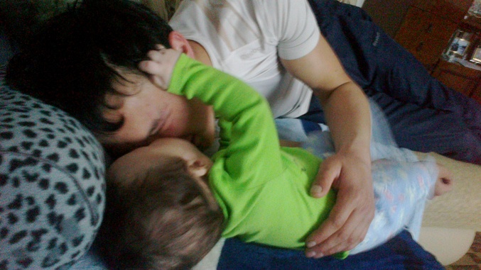 у нашего папы вчера и сегодня-выходные дни на работе, играл с сынулей с утра)) Даня дергает папу за волосы и попутно кусает: