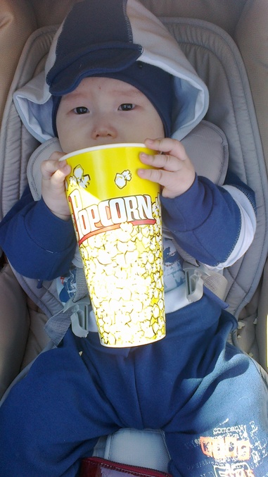 через неделю нам полгода!!! ОФИГЕТЬ) рост см 70, вес думаю ближе к 9 кг, точно узнаем когда пойдем на прием) умелки перечислять не буду, у всех они похожи) расскажу чем мы занимались) во-первых, ходили на праздник, увидели впервые стооолькоо народу) еще раз всех с праздником))) мама купила попкорн, а Даня отобрал и начал грызть стаканчик)