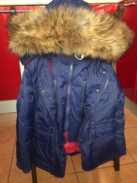 Куртка 6 лет. Мех отстегивается, капюшон отстегивается, подкладка красная, внутри карманчики в т.ч. для мобильного, трикотажный воротник отстегивается. Состав: 80% пух, 20% перо.