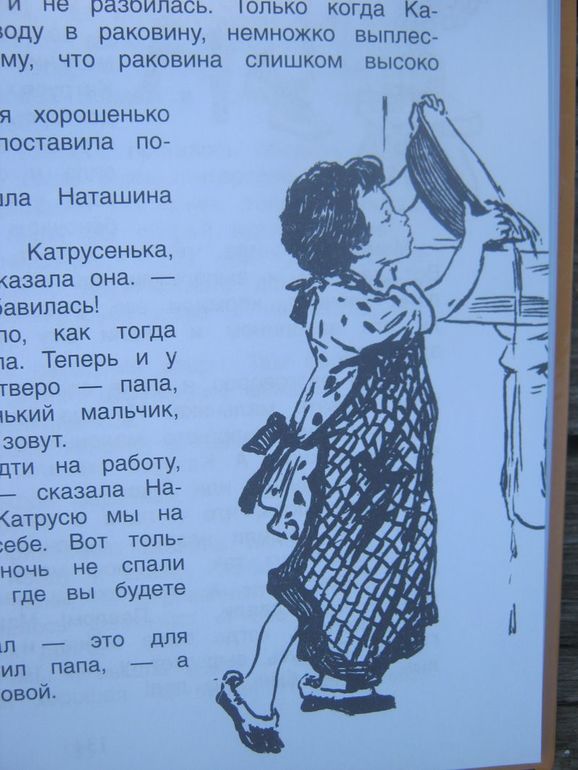 Книга читается очень легко, быстро. Интересно, что же приключится с Катрусей дальше, в какие ситуации она попадет, что из этого вынесет. И еще мне очень нравится поведение взрослых, такое любящее и наставительное, они во многих ситуациях как бы подталкивают Катрусю самой сделать какие-то выводы и сделать еще один шажок на пути к своему взрослению. Понятный язык, текста много, картинок мало, так что думаю после 4-5 лет книга будет актуальна для чтения родителями детям. Кроме того, героиня девочка, поэтому особенно для девочек будет интересно почитать. Не буду уже конкретно писать о всяческих коротеньких историях и ситуациях, чтобы было интересно читать тем, кто захочет почитать. Еще добавлю, что иллюстрации, хоть и черно-белые, но невероятно толковые и «говорящие». Художница Н. Яблонская очень точно передала образ жизнерадостной и любознательной пятилетней девочки. Каждая картинка словно маленькая история, а детали можно и самому додумать. Книгу я прочитала сама, а дочка еще не доросла для такого «серьезного» чтения, но это нам нисколько не помешало полистать и посмотреть картинки.