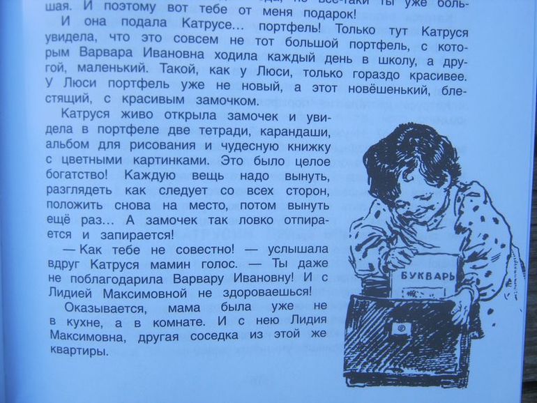 Хочу привести небольшой отрывок, который немного меня, даже не знаю как выразиться, возмутил наверно, короче взбаламутил и долго не давал мне покоя. Итак, на День Рождения Катруси, пожилая учительница из соседней комнаты (а живут они в коммунальной квартире) дарит Катрусе потрясающий подарок на пятилетие. Она подарила ей … портфель!