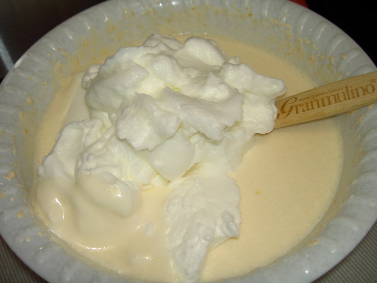 Белки взбиваем миксером с добавлением щепотки соли (это нужно, чтобы они лучше взбились) до устойчивых пиков. Вводим в тесто взбитые белки в несколько этапов, аккуратно перемешивая массу. Не нужно добиваться полной однородности. Тесто должно быть жидким, воздушным и слегка неоднородным.