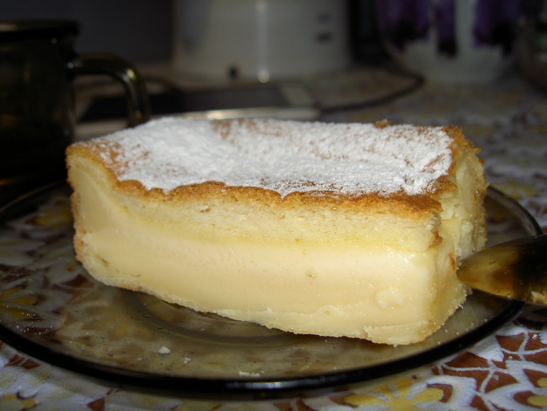 Поставим в разогретую до 175-180 градусов духовку. Выпекать примерно 70-80 минут. Готовый пирог должен слегка дрожать, если его немного тряхнуть. Дайте пирогу остыть и посыпьте сахарной пудрой. В итоге у вас должен получиться пирог, состоящий из двух коржей с нежной кремовой прослойкой посередине, по вкусу напоминающей мусс. Вот такое вот волшебство.