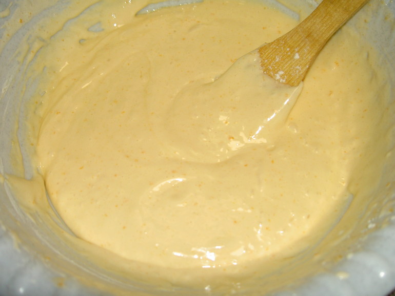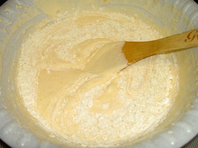 Теперь пришла пора ввести в массу муку. Ее необходимо насытить кислородом, поэтому просейте муку трижды через мелкое сито. После этого в три этапа вводим муку в тесто, аккуратно перемешивая лопаточкой (взбивать миксером не нужно).
