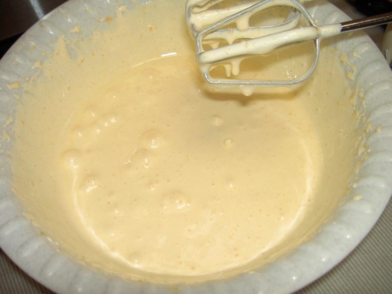 В это время отделим белки от желтков. К желткам добавим сахар, воду и ванилин. Можно взять вместо ванилина ванильный сахар, заменив им часть сахарного песка. Тщательно взобьем миксером до пышности. На это у меня ушло минут 5-6. Добавляем в массу немного остывшее сливочное масло. Вновь тщательно взбиваем миксером.