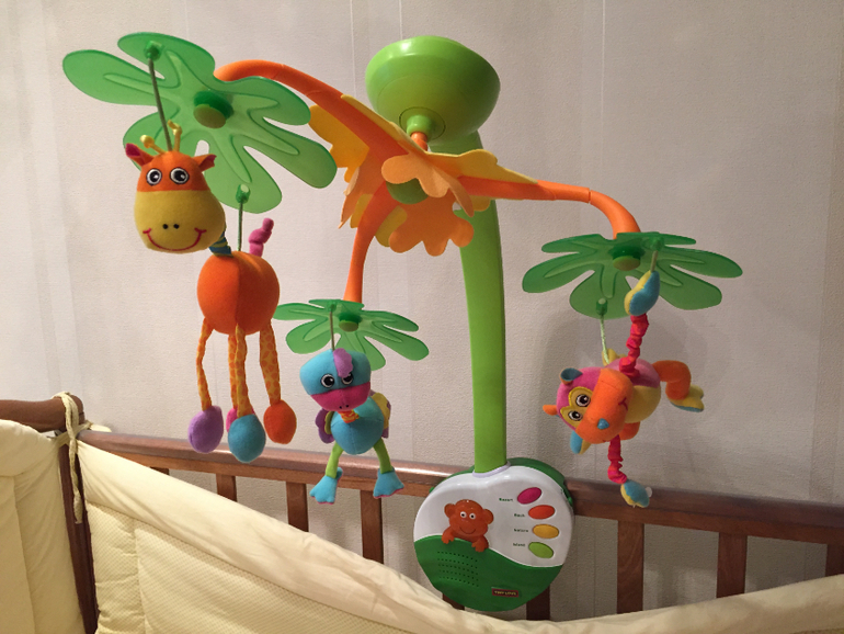 Tiny Love Остров сладких грез - электронный мобиль с функцией ночника от крупнейшего производителя детских игрушек. Мобиль представляет собой карусель с тремя яркими подвесными игрушками: обезьянка с дрожащими ручками, жираф с вибрирующей шеей и страусенок с шуршащими лапками. Игрушки вращаются не только по кругу, но и вокруг своей оси, привлекая внимание ребенка. В мобиль встроен музыкальный блок с набором классических мелодий и звуков природы, которые оказывают успокаивающее действие на малыша. Сняв карусель с игрушками, изделие можно использовать в качестве ночника. Включить и выключить мобиль, отрегулировать громкость и выбрать мелодию позволит пульт дистанционного управления, который работает на расстоянии до 5 метров. Мобиль развивает зрение и слух малыша, учит следить за предметами, дает представление о цветовой палитре, а игрушки с разнофактурными элементами способствуют развитию мелкой моторики и тактильного восприятия.