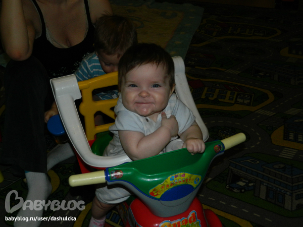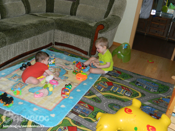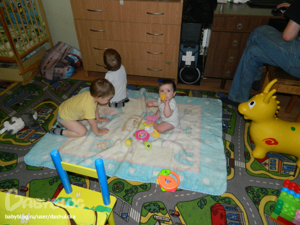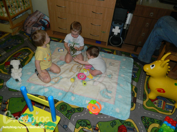 с Ванькой у Насти совсместное сосуществование. а вот с Димоном - любовь-морковь))))) Настена к ним тянеться, ей очень интересно. а вот мальчики как-то по настроению, не всегда хотят с ней играть. ну это и понятно, она же не может пока бегать по коридору и мяч гонять.