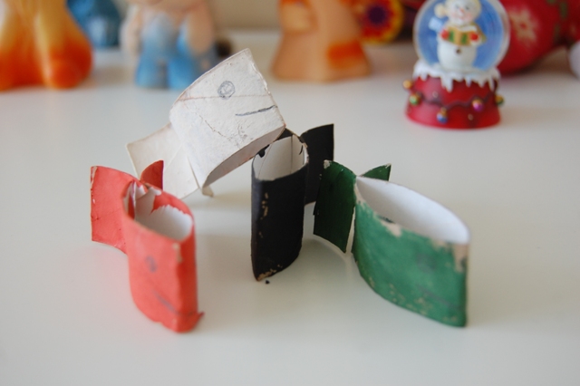На первом фото рыбки, ставшие на пару дней героями игр. Хотела добавить ссылку, но где-то потеряла ее... все сделано из цилиндра от туалетной бумаги, разрезанного на 4 маленьких цилиндра...